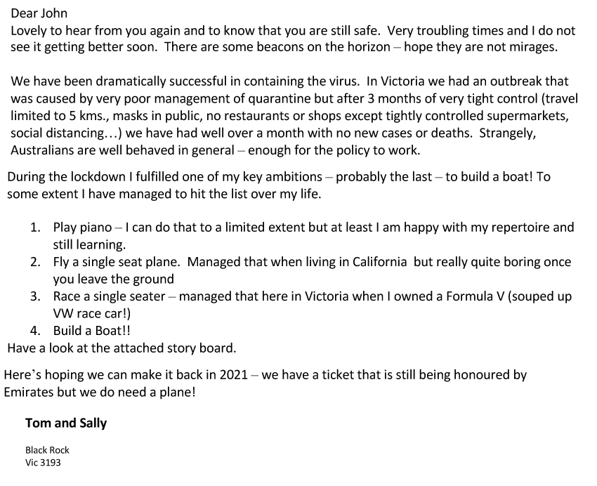 Tom Chapman (1952 to 59) writes from Melbourne, Australia, to describe his latest